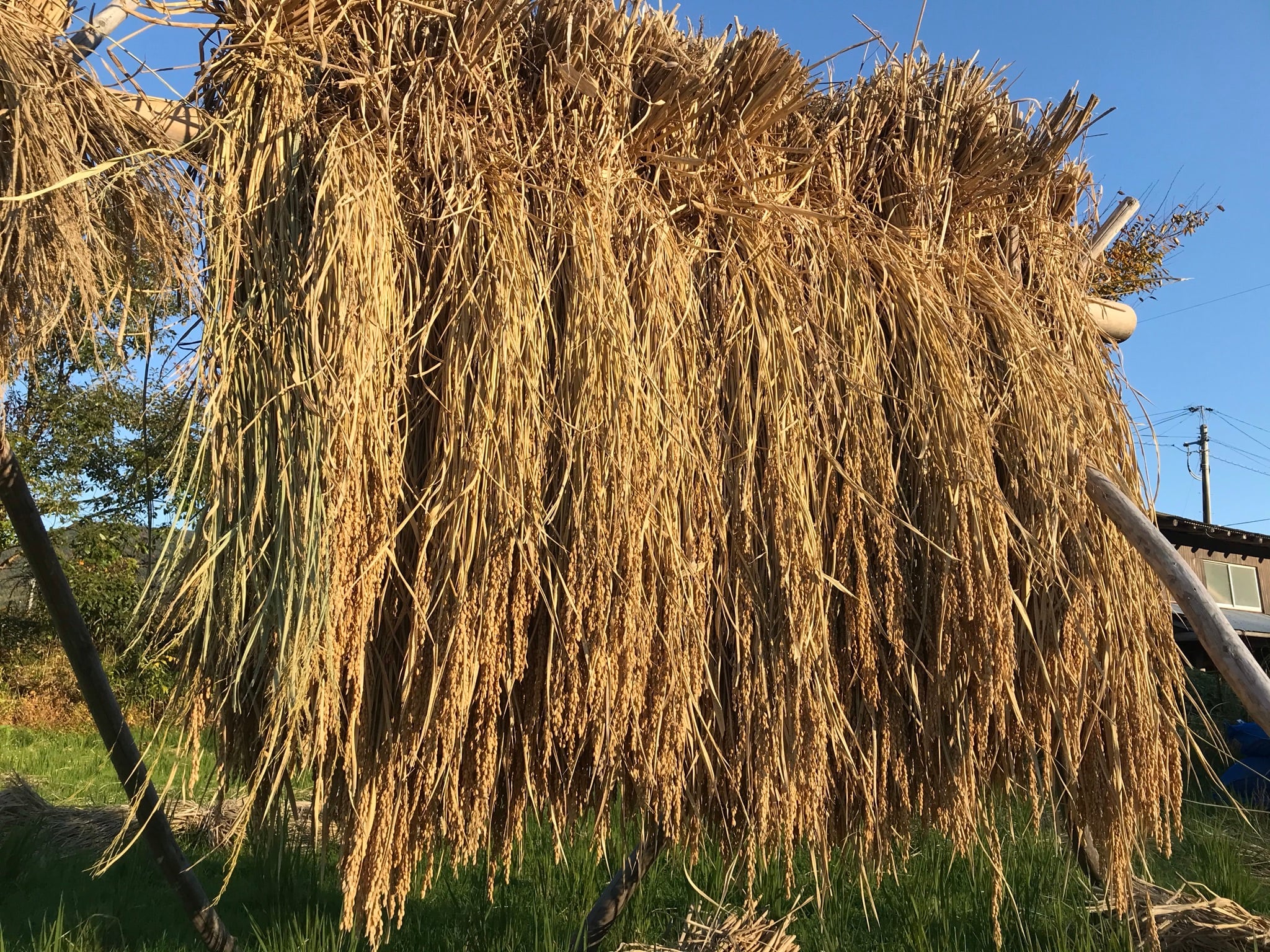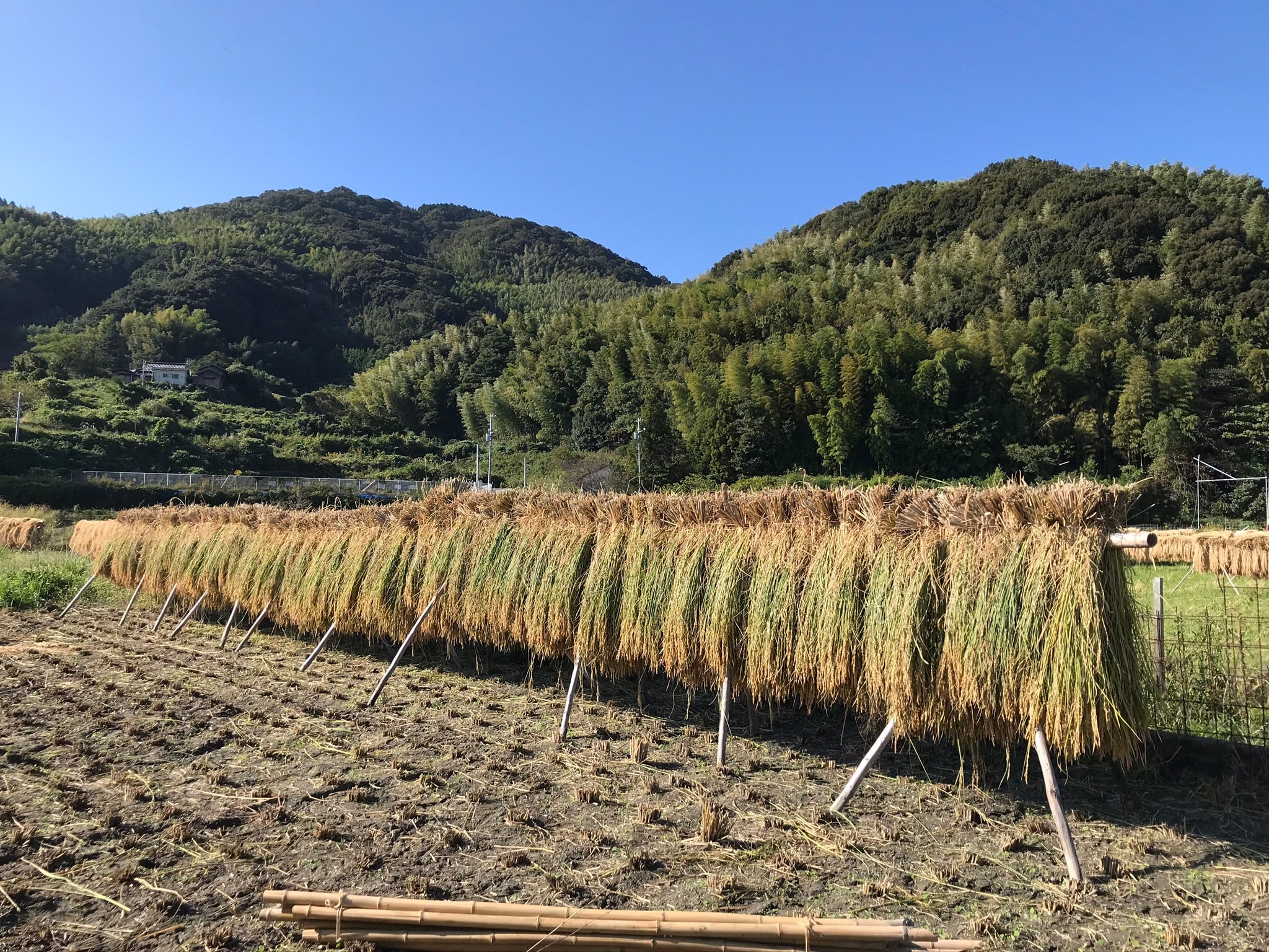 お米の乾燥は、山から伐り出した竹に掛けて、天日で干します。
